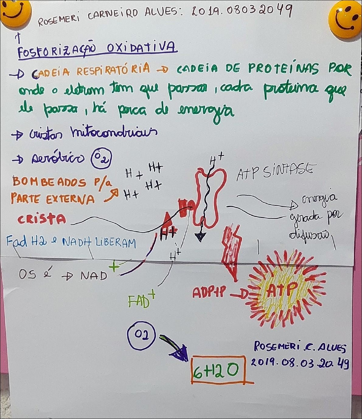 Finalmente, os prótons retornam à matriz mitocondrial através de um complexo enzimático chamado ATP sintase (complexo V). A passagem dos prótons através da ATP sintase impulsiona a rotação de uma subunidade, que catalisa a fosforilação do ADP, convertendo-o em ATP.