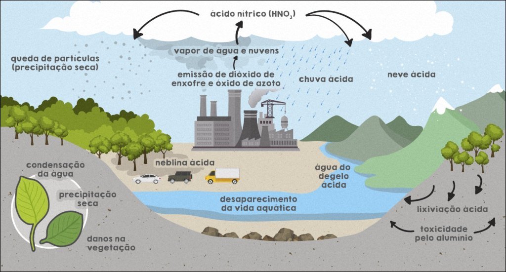 A chuva ácida é um fenômeno ambiental que ocorre quando poluentes atmosféricos, principalmente dióxido de enxofre (SO2) e óxidos de nitrogênio (NOx), reagem com a água na atmosfera, formando ácidos sulfúrico e nítrico. Esses ácidos, então, precipitam na forma de chuva, neve, granizo ou névoa, com um pH inferior a 5,6.