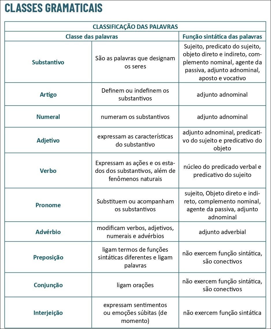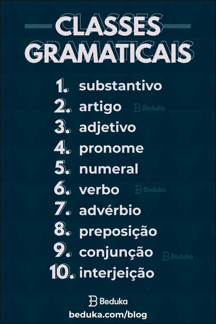 Existem dez classes gramaticais principais: substantivo, artigo, adjetivo, pronome, numeral, verbo, advérbio, preposição, conjunção e interjeição.