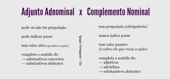 Diferentemente do adjunto adnominal, que apenas caracteriza o substantivo, o complemento nominal se relaciona com a ação ou estado expressos pelo nome. Ele indica a quem ou a que o substantivo se refere, completa uma necessidade de sentido e, geralmente, é introduzido por preposição.