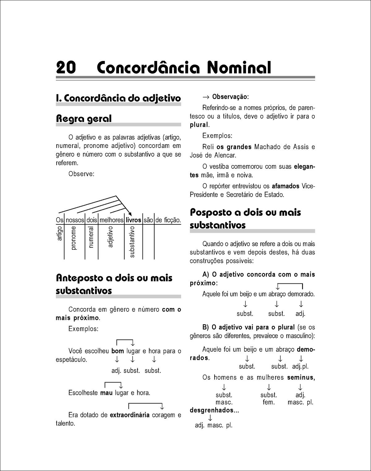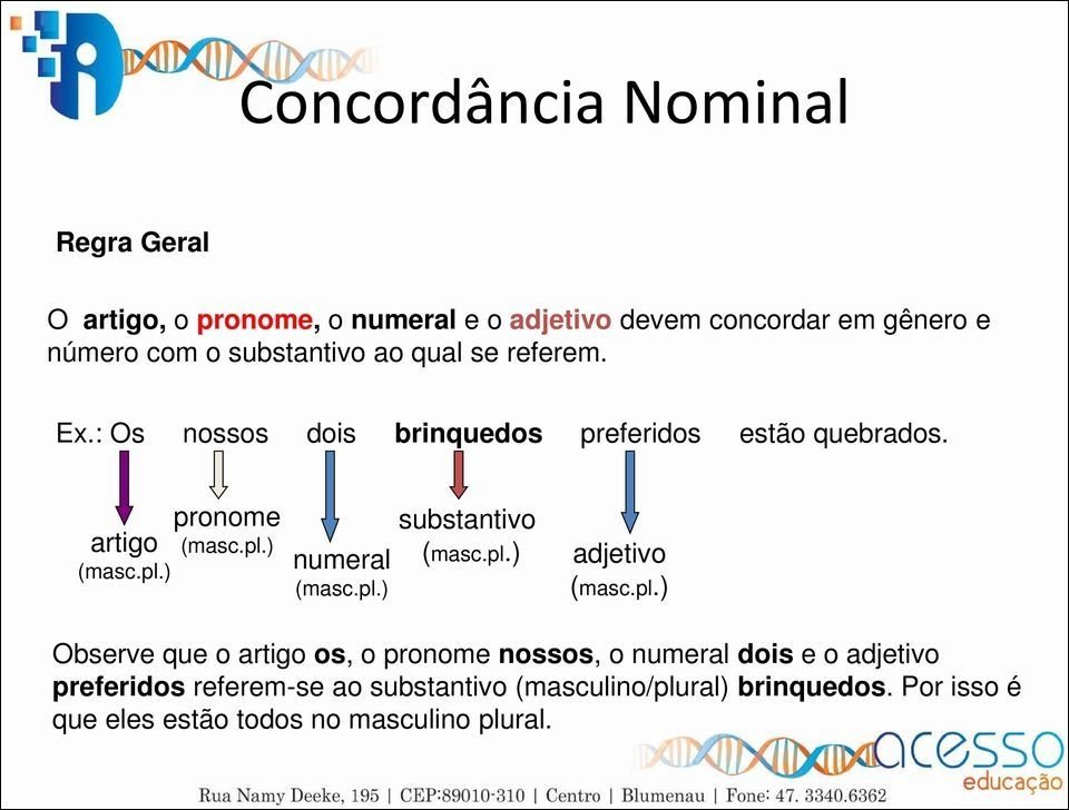 Basicamente, a concordância nominal estabelece que os adjetivos, artigos, pronomes adjetivos e numerais devem concordar em gênero e número com o substantivo a que se referem, ou seja, com o termo principal da frase. Por exemplo, se o substantivo estiver no plural e for feminino (as casas), todos os seus modificadores também deverão estar no plural e no feminino (as casas grandes, as minhas casas, duas casas).