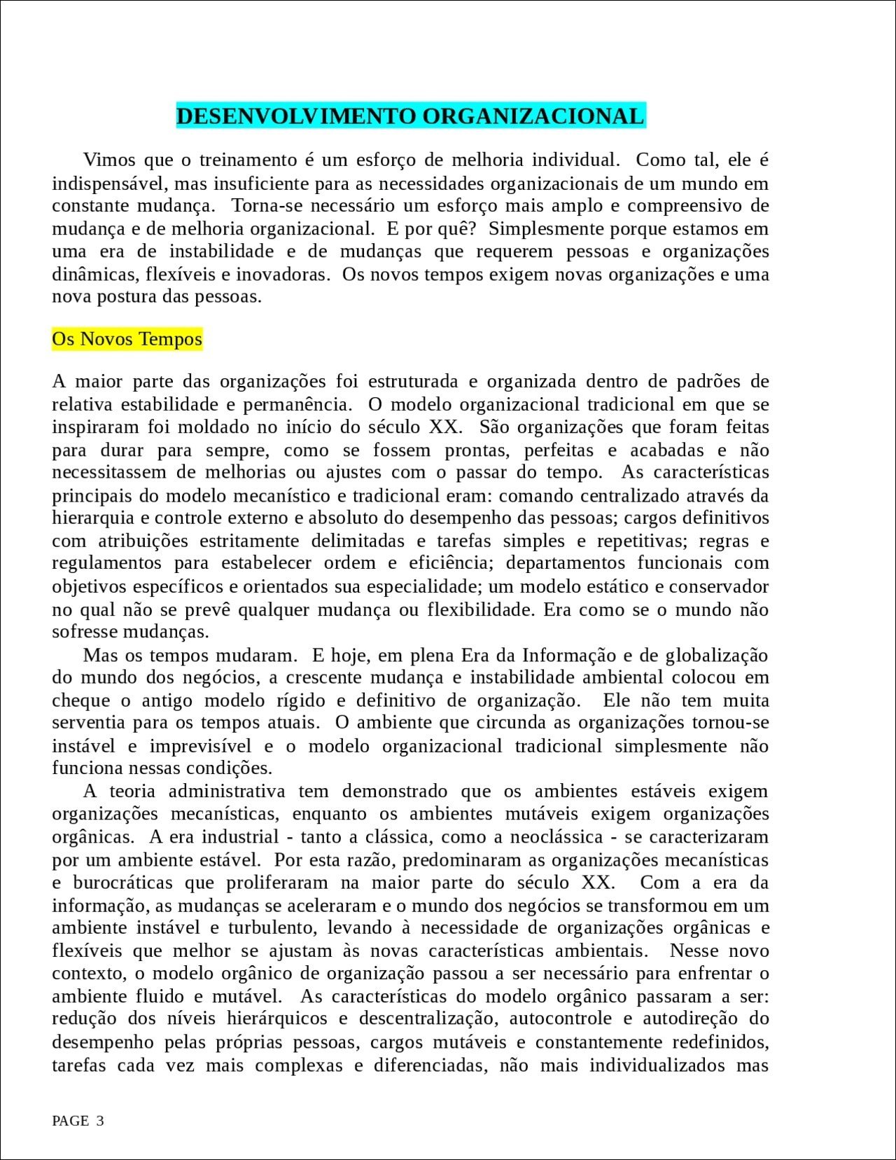Em resumo, o Desenvolvimento Organizacional é um esforço abrangente e contínuo para aprimorar a organização em todos os seus níveis, criando um ambiente onde as pessoas se sentem valorizadas, engajadas e capacitadas a contribuir para o sucesso da organização. Ele busca construir uma cultura de confiança, colaboração e aprendizado que sustente a organização em um cenário em constante mudança.