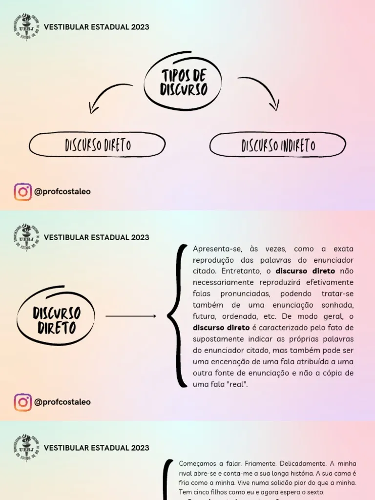 O discurso direto e indireto são formas essenciais de reportar o que alguém disse. Eles oferecem maneiras diferentes de transmitir a fala de um personagem, cada um com suas próprias nuances e efeitos estilísticos.