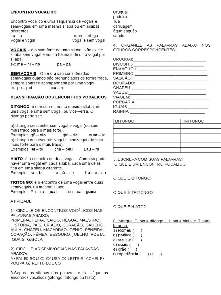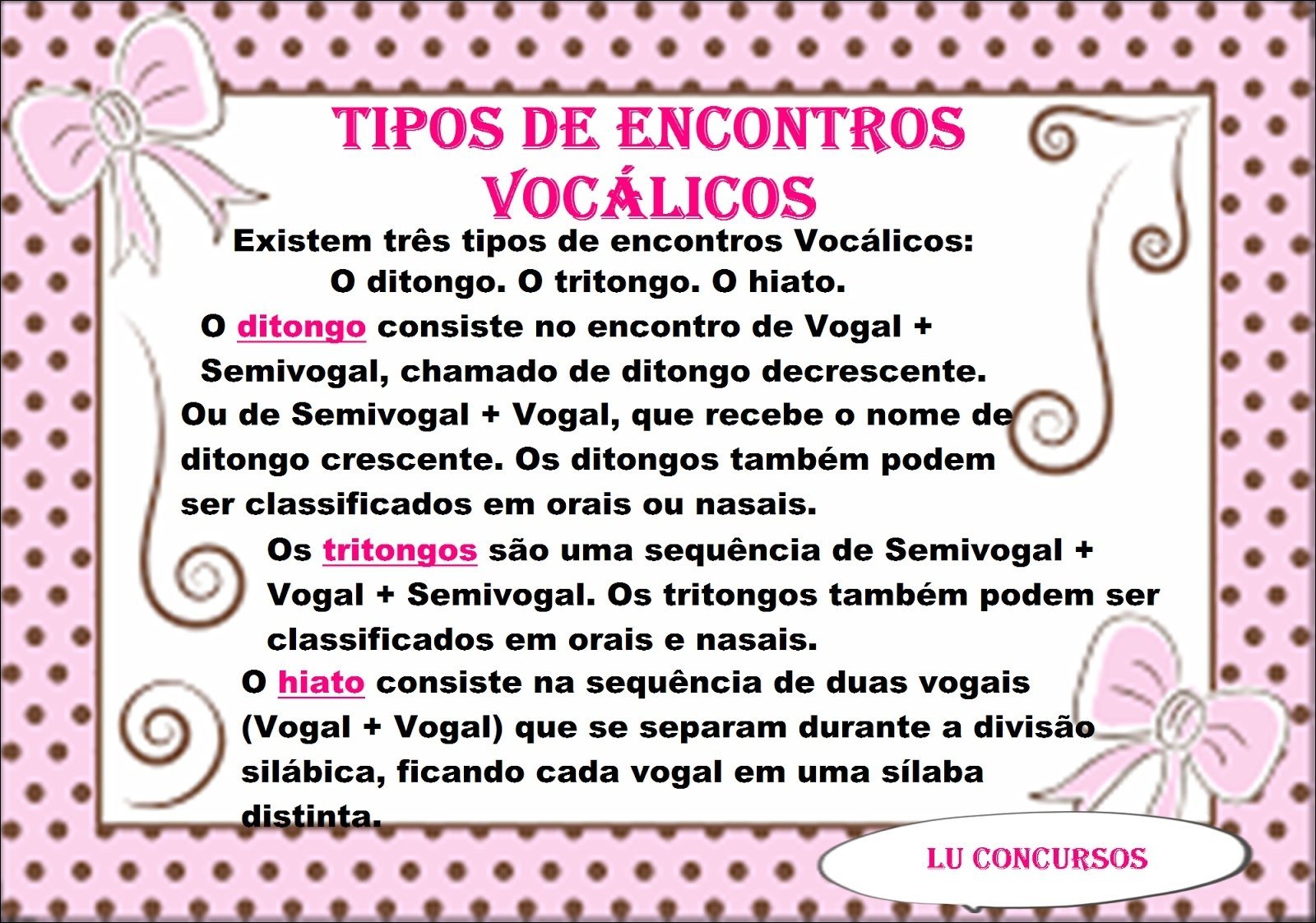 Existem três tipos principais de encontros vocálicos: ditongo, tritongo e hiato. O ditongo ocorre quando duas vogais se unem em uma mesma sílaba, sendo uma vogal e uma semivogal (som mais fraco) ou vice-versa. Exemplos incluem “pai” (ditongo decrescente), “mágoa” (ditongo crescente) e “sério” (ditongo oral).