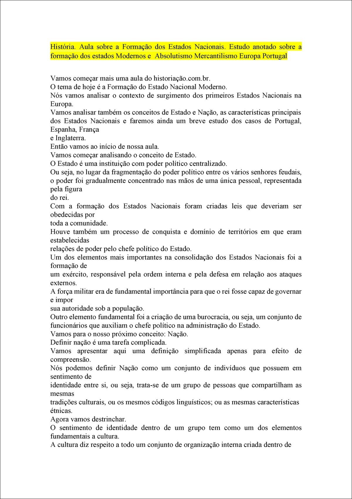 Resumo sobre Formação dos estados nacionais