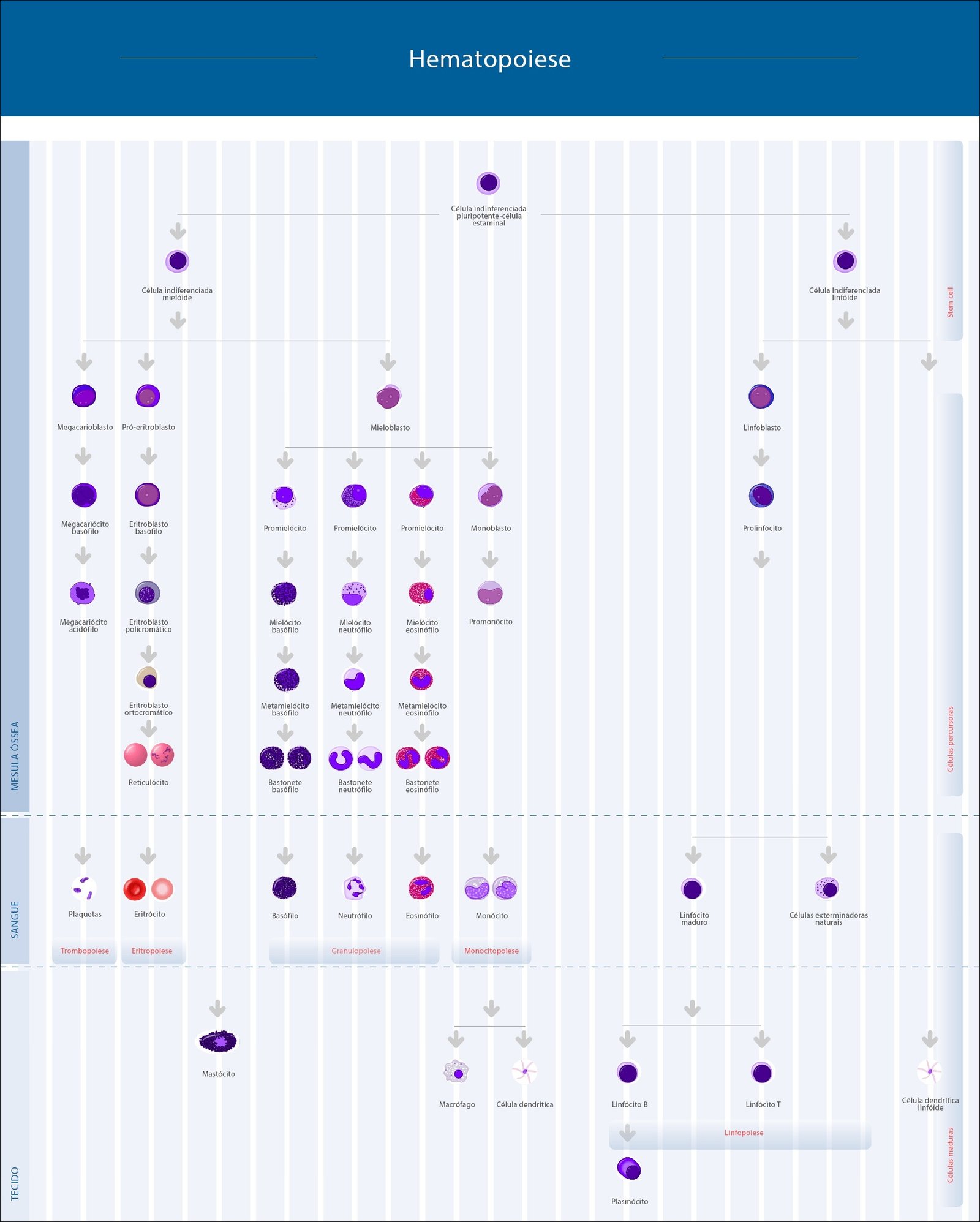 A hematopoiese é o processo vital de formação, desenvolvimento e maturação das células sanguíneas (glóbulos vermelhos, glóbulos brancos e plaquetas) a partir de células-tronco hematopoiéticas (CTH) localizadas principalmente na medula óssea. Esse processo dinâmico e complexo garante a renovação constante do sangue, essencial para a manutenção da saúde e a resposta imunológica.