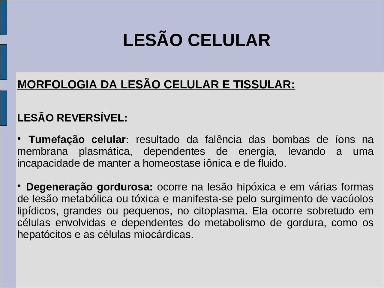 A lesão celular pode ser reversível ou irreversível, dependendo da intensidade e duração do agressor, bem como da capacidade de adaptação da célula. As lesões reversíveis geralmente envolvem alterações funcionais e estruturais leves, como edema celular, acúmulo de gordura e alterações na atividade metabólica. Se o estresse for removido, a célula pode se recuperar e voltar ao seu estado normal.