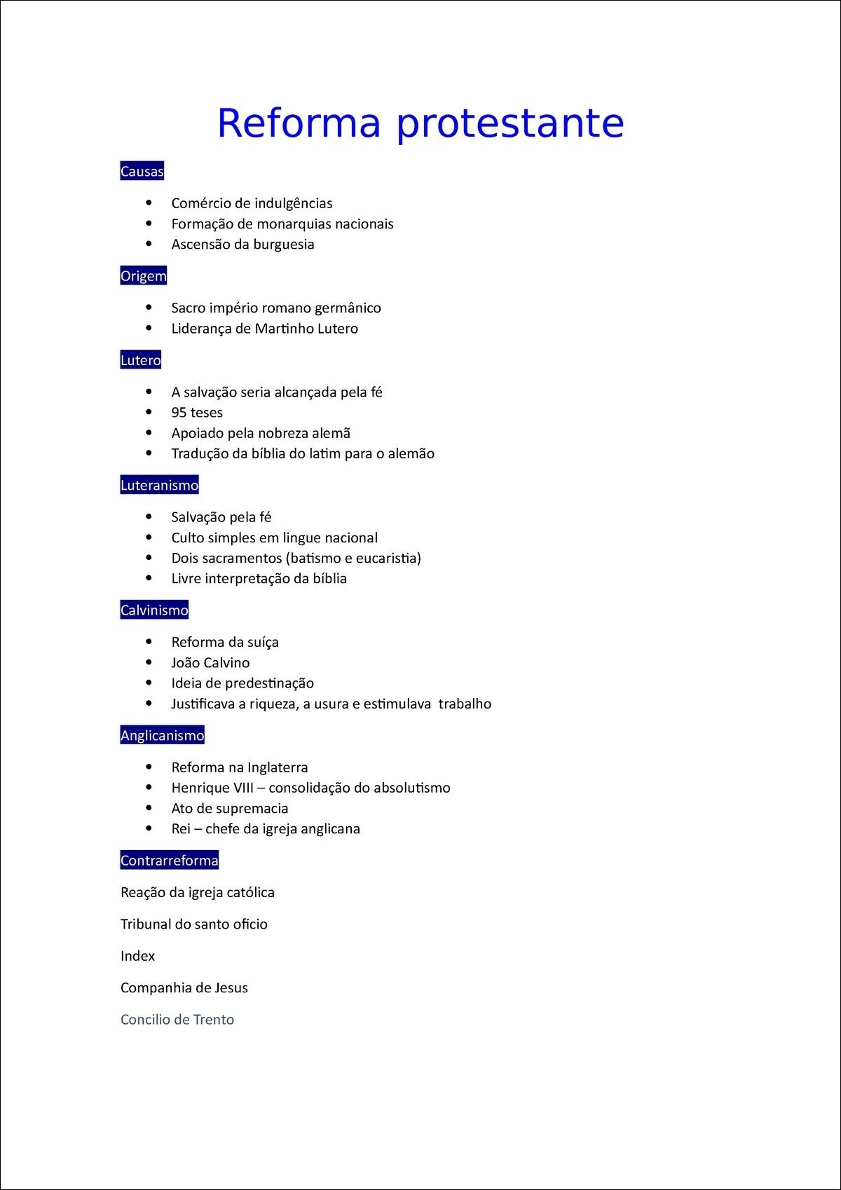 Em 1517, ele publicou as 95 Teses, um documento que criticava a venda de indulgências, um perdão de pecados comprado. Essa ação marcou o ponto de partida da Reforma, que rapidamente se espalhou pela Europa. Lutero defendia a justificação pela fé, ou seja, a salvação é alcançada através da fé em Jesus Cristo, e não por boas obras. Ele traduziu a Bíblia para o alemão, tornando-a acessível ao povo comum e promovendo a interpretação individual das Escrituras.