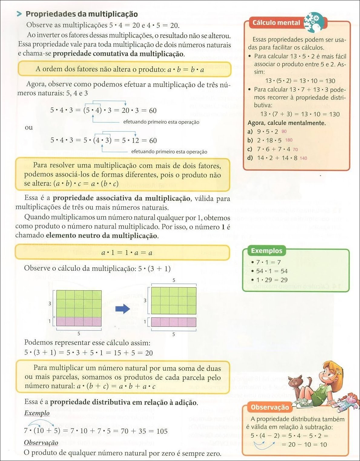 A multiplicação possui propriedades importantes que simplificam os cálculos e a compreensão: a propriedade comutativa (a ordem dos fatores não altera o produto), a propriedade associativa (a forma como os fatores são agrupados não altera o produto), a propriedade distributiva (que permite distribuir um fator sobre uma adição ou subtração) e o elemento neutro (o número 1, que multiplicado por qualquer outro número resulta no próprio número).