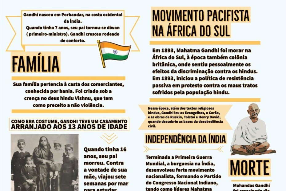 Compilação com os melhores mapas mentais, conceituais, infográficos, diagramas e resumos sobre Mahatma Gandhi.