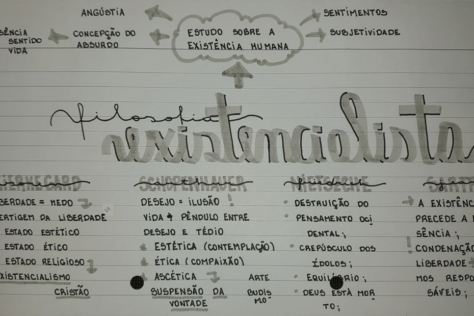 Compilação com os melhores mapas mentais, conceituais, infográficos, diagramas e resumos sobre existencialismo.