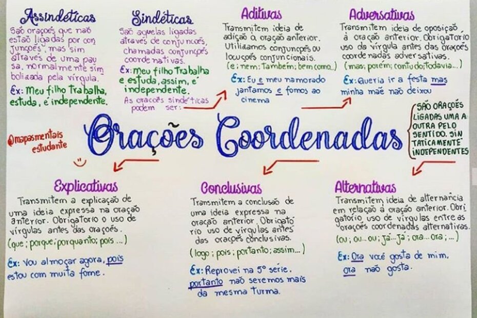 Compilação com os melhores mapas mentais, conceituais, infográficos, diagramas e resumos sobre Orações coordenadas.