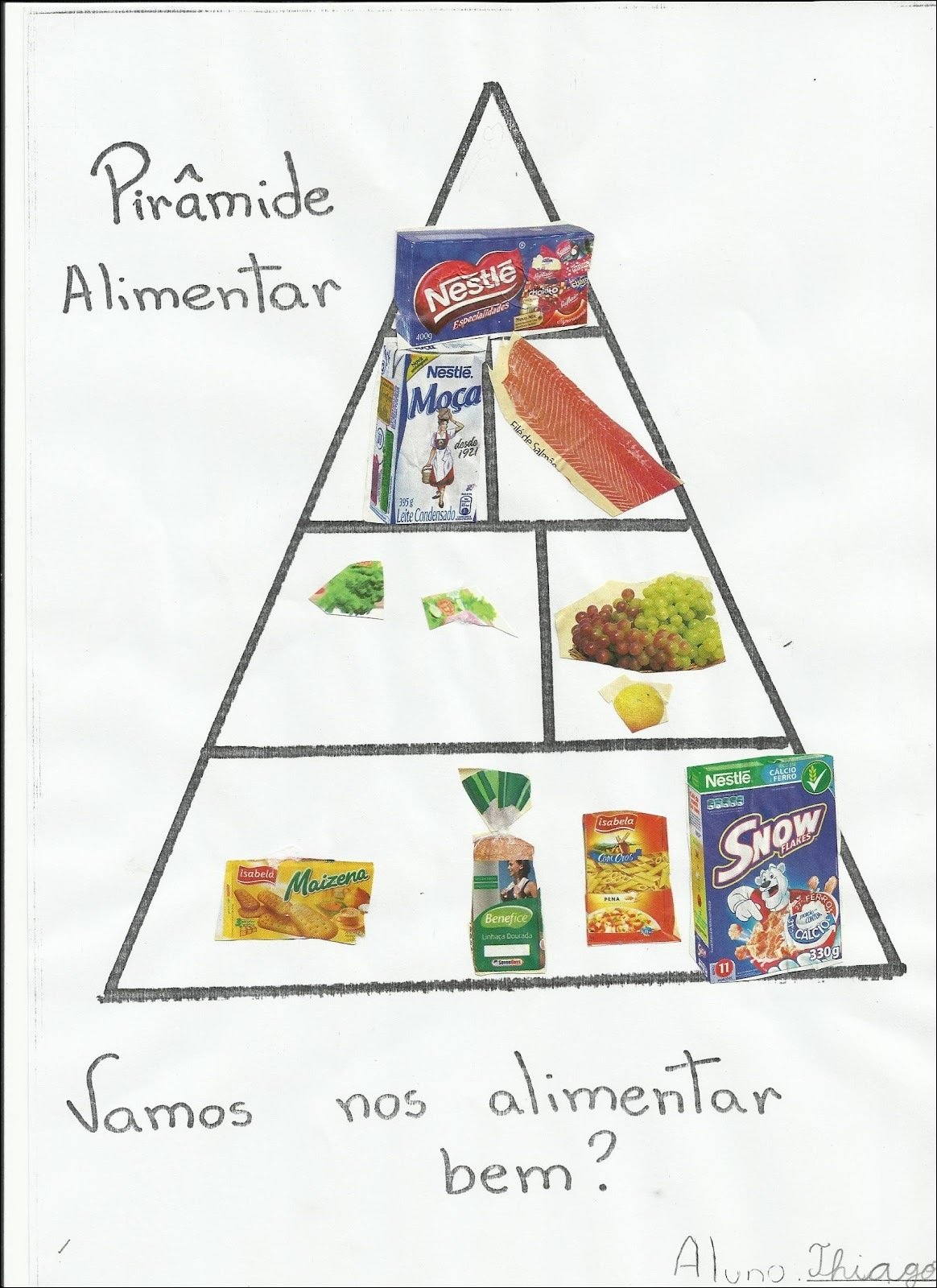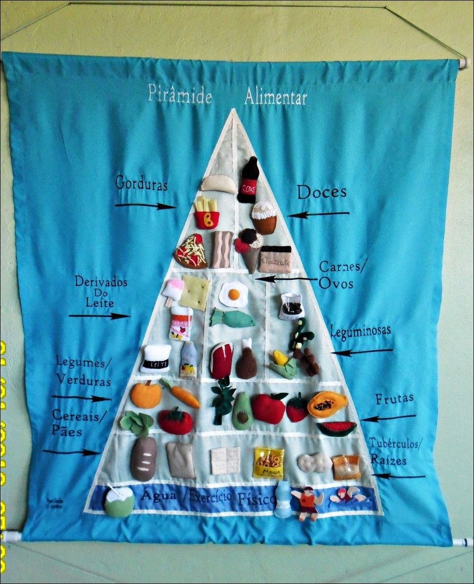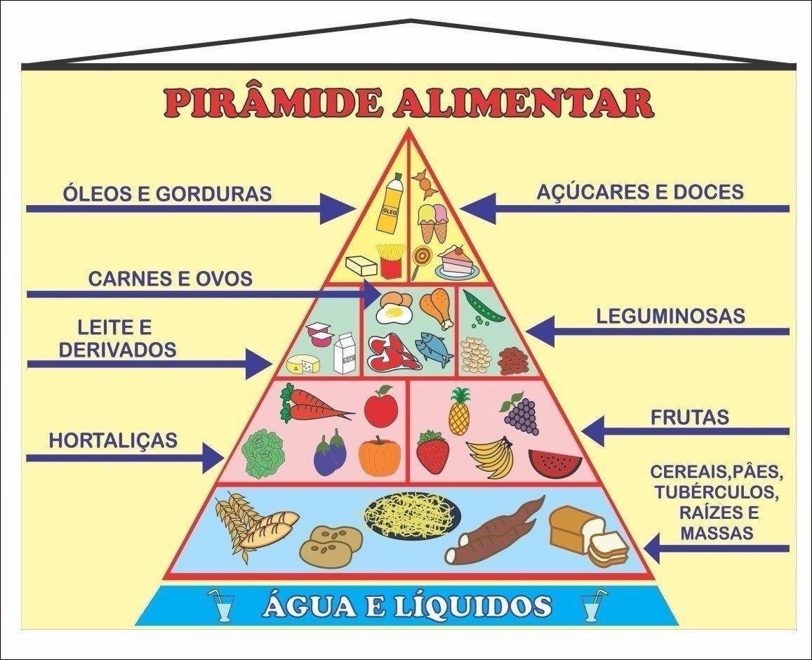 Na base da pirâmide, encontram-se os alimentos que devem ser consumidos em maior quantidade, como grãos integrais, que fornecem energia e fibras essenciais. Acima, estão frutas, vegetais e hortaliças, ricos em vitaminas, minerais e antioxidantes, que devem compor uma porção significativa da dieta. No nível seguinte, encontram-se proteínas, como carnes magras, peixes, ovos e leguminosas, importantes para a construção e reparo de tecidos, e laticínios, fontes de cálcio e proteínas.