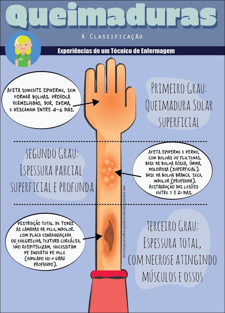 As queimaduras são classificadas em graus, sendo: primeiro grau (afeta apenas a epiderme, como uma queimadura solar), segundo grau (atinge a epiderme e parte da derme, com formação de bolhas) e terceiro grau (destrói todas as camadas da pele, podendo afetar músculos e ossos). Queimaduras de terceiro grau exigem atenção médica imediata e podem levar a complicações sérias.