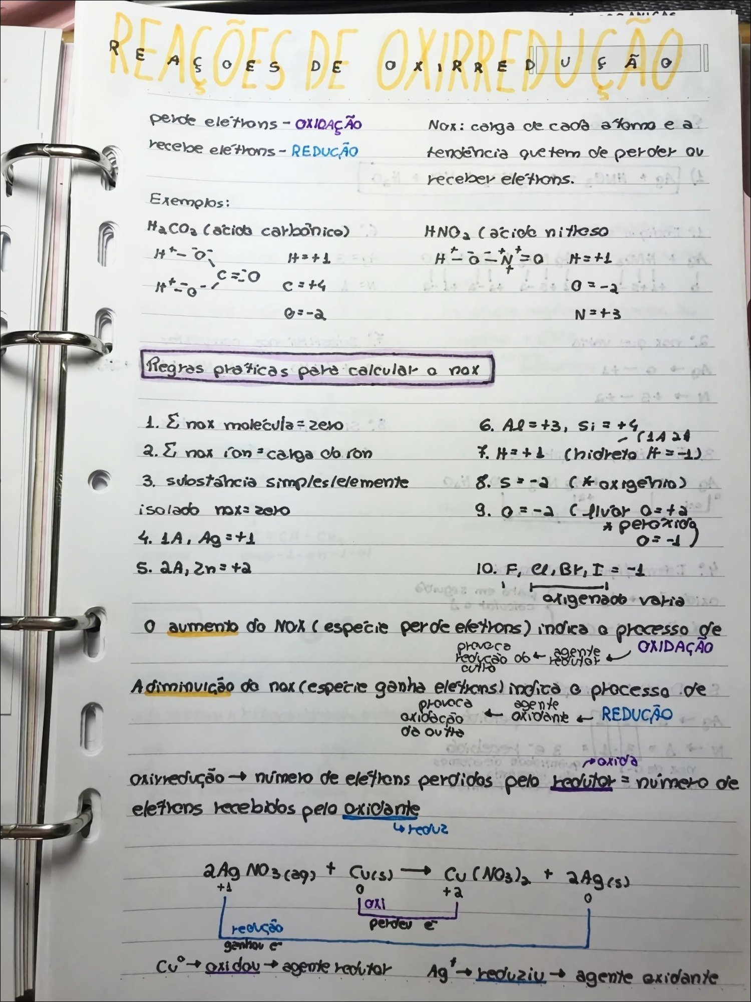 A oxirredução é composta por duas metades: oxidação e redução. A oxidação ocorre quando uma espécie química perde elétrons, aumentando seu número de oxidação. A redução ocorre quando uma espécie química ganha elétrons, diminuindo seu número de oxidação. Importante ressaltar que a oxidação e a redução sempre ocorrem simultaneamente, pois os elétrons perdidos em uma reação de oxidação são ganhos em uma reação de redução.
