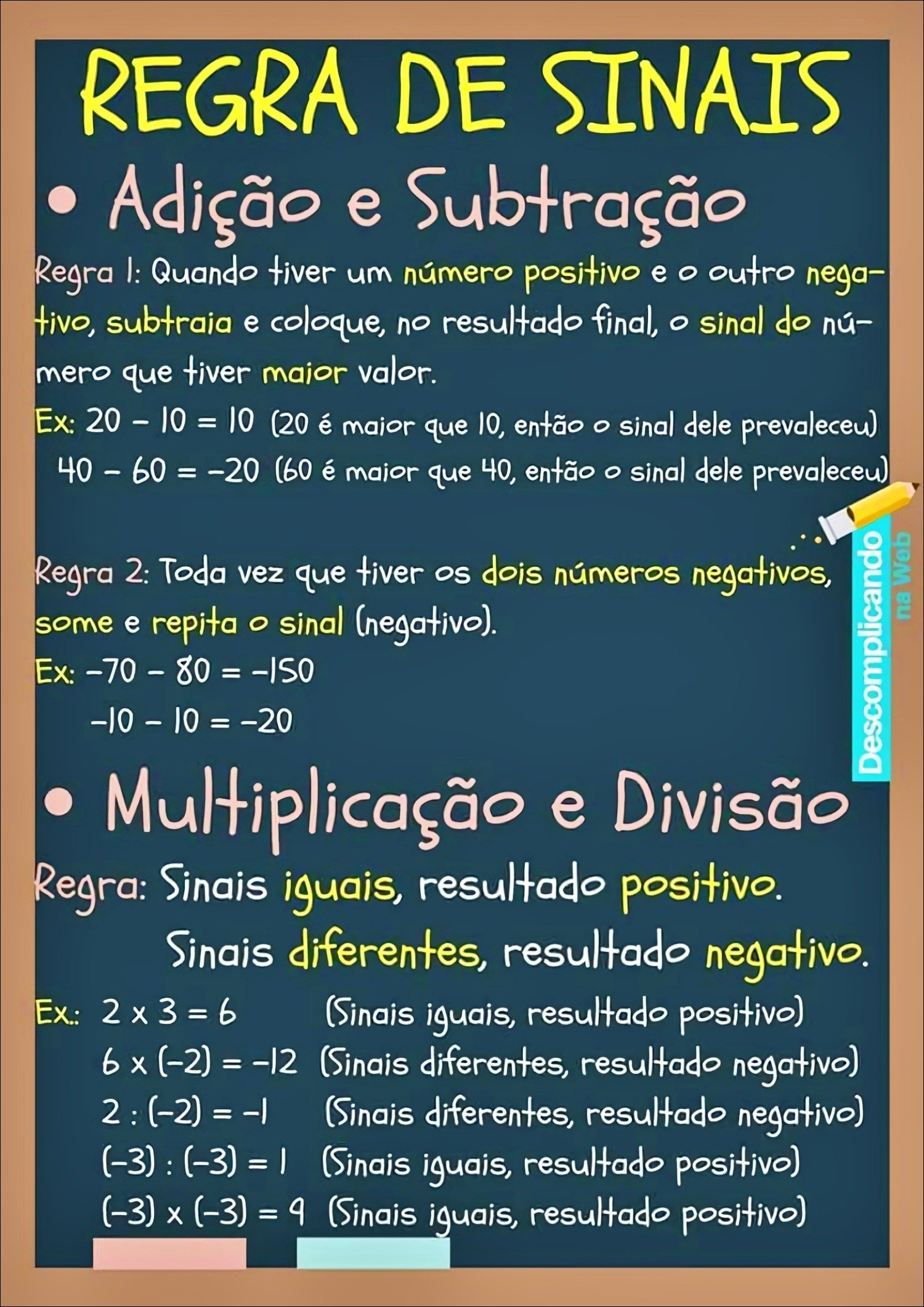 Em outras palavras, quando os sinais são iguais (ambos positivos ou ambos negativos), o resultado da multiplicação ou divisão é positivo. Quando os sinais são diferentes (um positivo e um negativo), o resultado é negativo.
