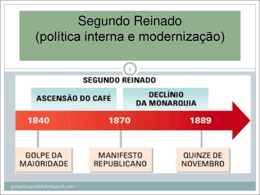 Politicamente, o período foi marcado pela estabilidade institucional proporcionada pela figura moderadora de D. Pedro II e pela alternância no poder entre os partidos Conservador e Liberal, através da prática do “parlamentarismo às avessas”, onde o imperador nomeava e destituía os gabinetes ministeriais conforme seus interesses. A economia, baseada na agricultura, teve no café sua principal fonte de riqueza, impulsionando o desenvolvimento de São Paulo e a importação de mão de obra escrava, que culminaria na Lei Áurea em 1888.