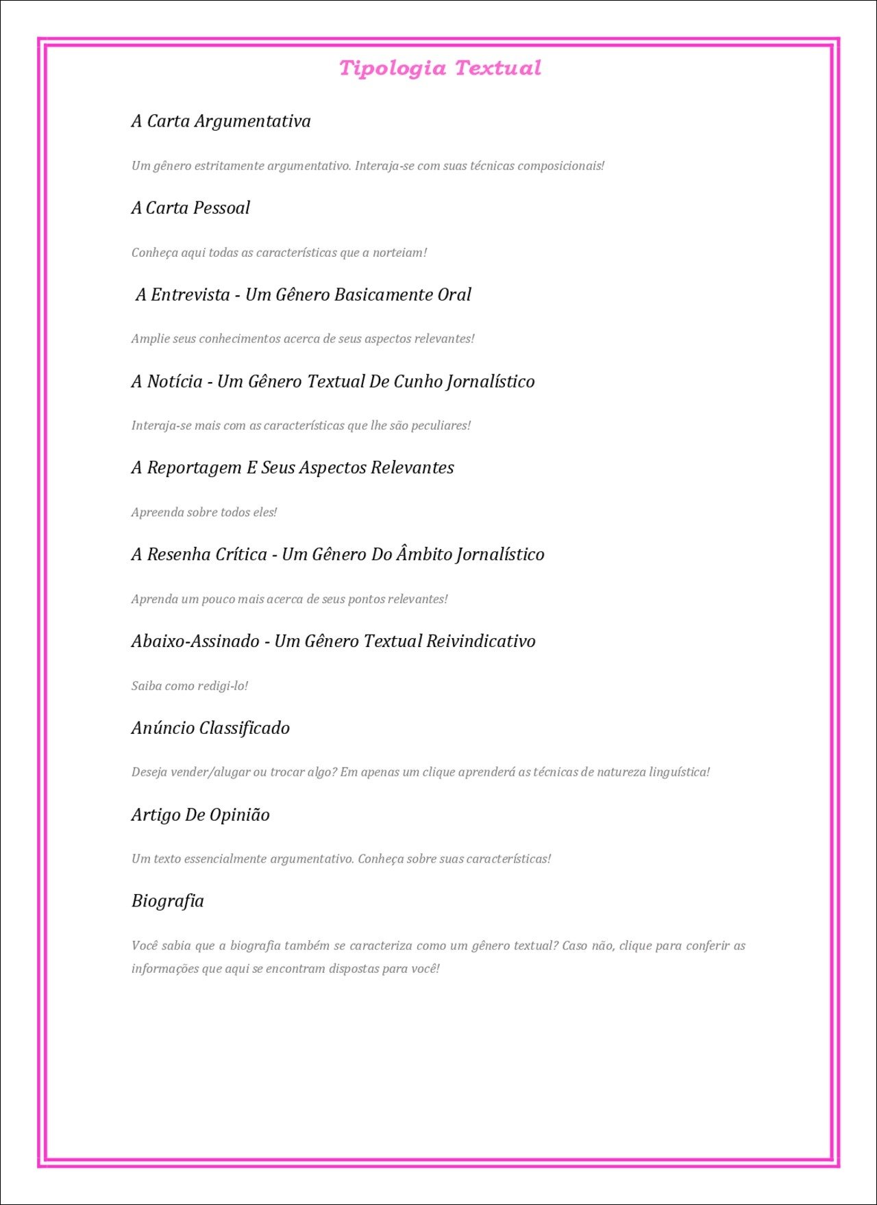 - Descrição: Apresenta características de pessoas, objetos, lugares ou sentimentos, utilizando recursos como adjetivos e comparações. Exemplos: guias turísticos, retratos, descrições de produtos.